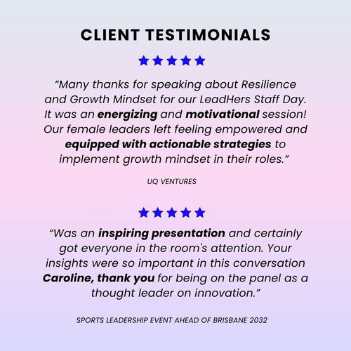Caroline tailors her talks to resonate deeply with each unique audience. Whether speaking to entrepreneurs and business owners, female founders, business leaders, employees, or government departments, Caroline customises her content and activities to ensure maximum impact.